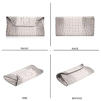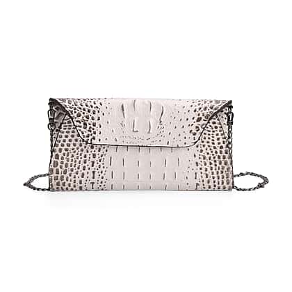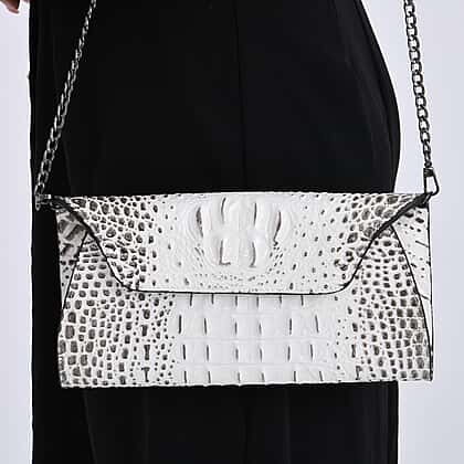 Designer Inspired - Embossed Genuine Leather Shoulder Bag with Long Chain - White & Beige