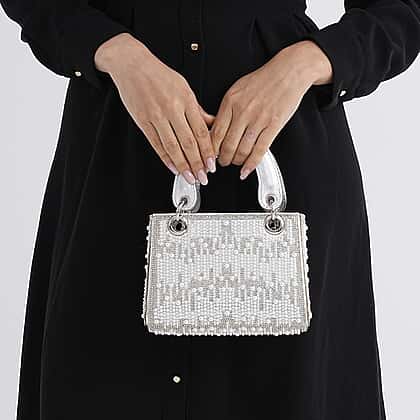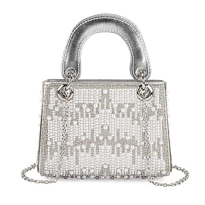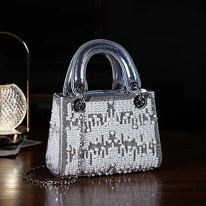 Designer Inspired- Toggle Clip Crystal Clutch Bag with Handle Drop - Silver