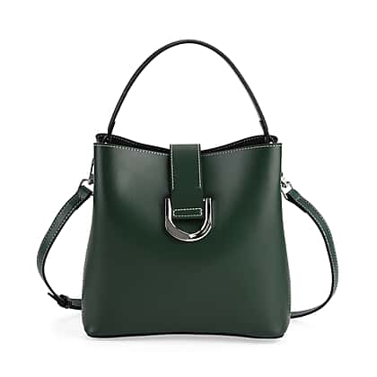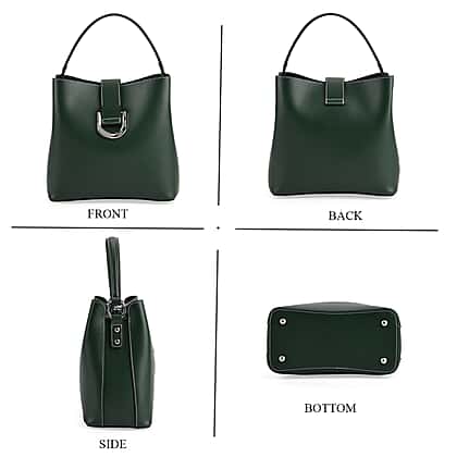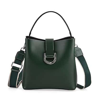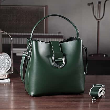 Designer Inspired Genuine Leather Bucket Bag with Detachable Strap (125cm) - Dark Green