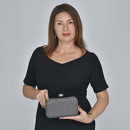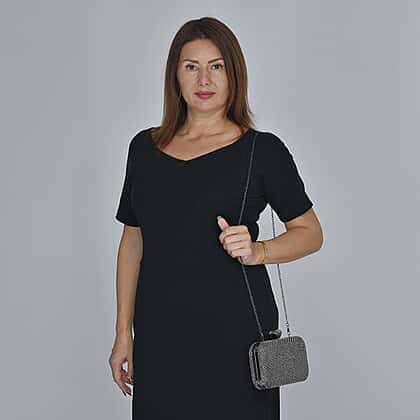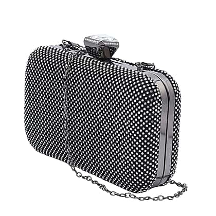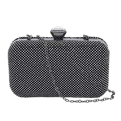White Austrian Crystal Studded Clutch Bag with Long Chain Strap - Black
