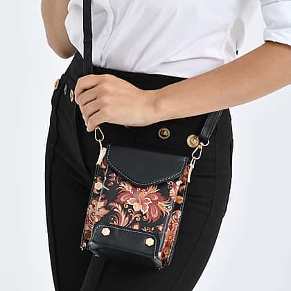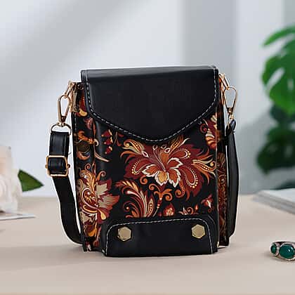 Floral Embroidered Crossbody Bag with Long Adjustable Strap - Black & Orange