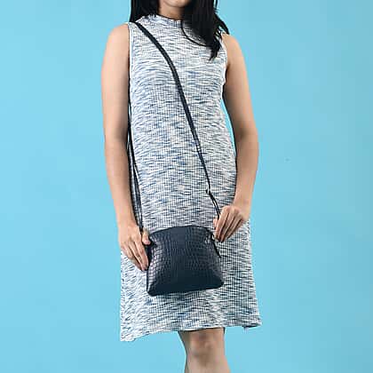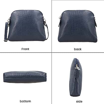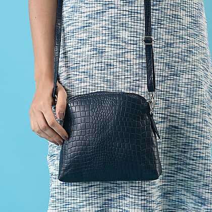 Genuine Leather Croc Embossed Crossbody Bag - Navy Blue