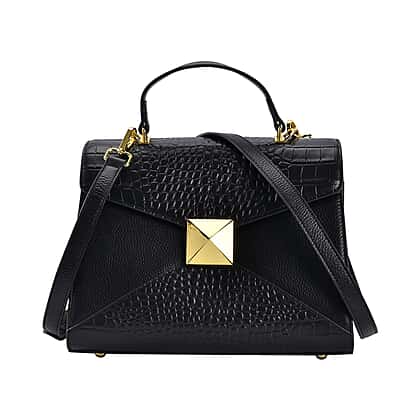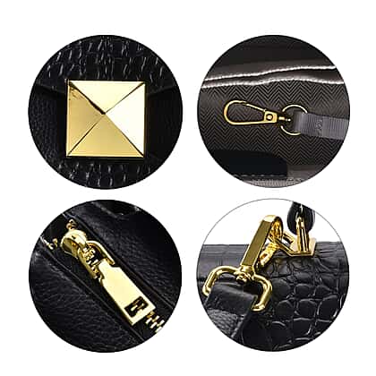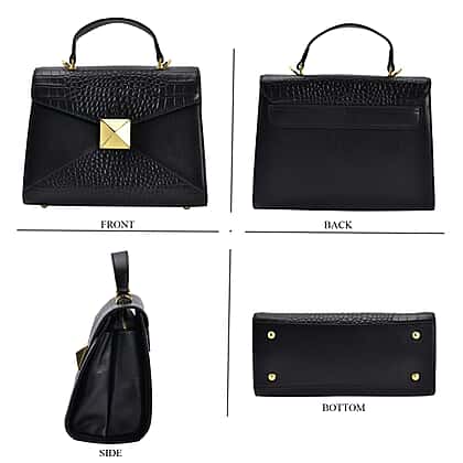 Designer Inspired - Genuine Leather Stud Handbag with Detachable Shoulder Strap - Black