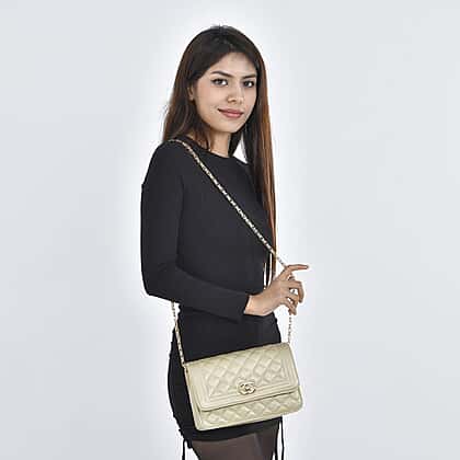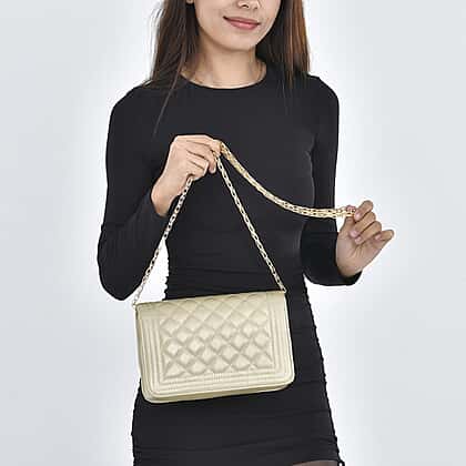 Closeout Deal - Genuine Leather Quilted Diamond Pattern Shoulder Bag with Panther Link Strap - Gold