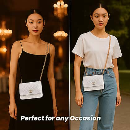 Genuine Leather Quilted Diamond Pattern Shoulder Bag with Panther Link Strap - White