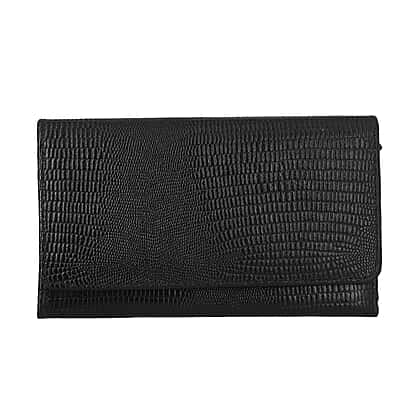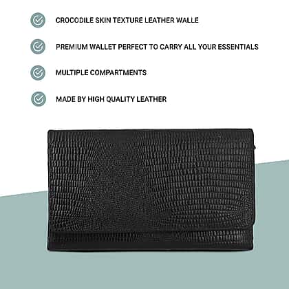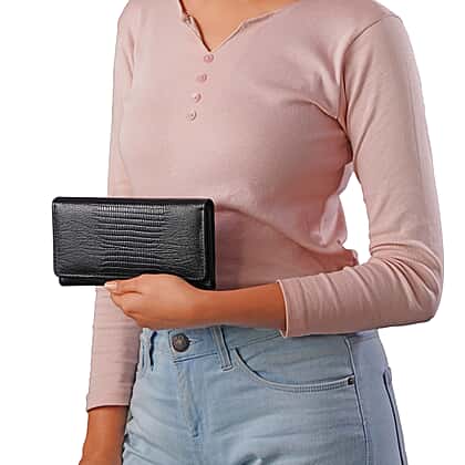Genuine Leather Lizard Embossed Pattern Womens Rfid Protected Wallet - Black