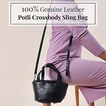 100% Genuine Leather Potli Crossbody Sling Bag - Black