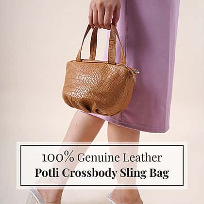 100% Genuine Leather Potli Crossbody Sling Bag - Tan