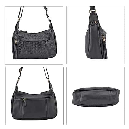 Genuine Leather Solid Crossbody Bag with Shoulder Strap - Black