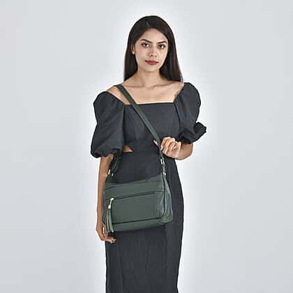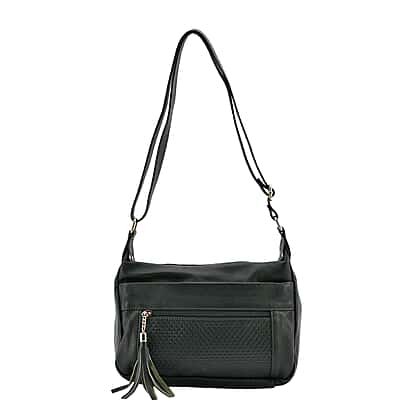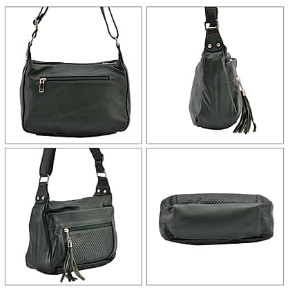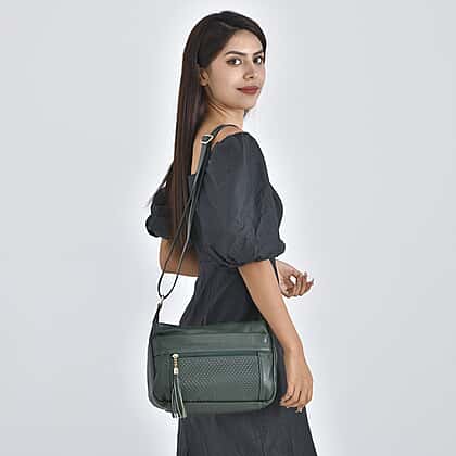 The Perfect pair with everything dark green colour crossbody bag is all set to grace the look of your outfit. It has an adjustable shoulder strap to give you a comfortable length. This bag is designed from genuine leather to give it a luxe appeal, with polyester lining inside to make it durable and lightweight. It has multiple pockets with a tassel and zipper pockets to keep your valuables safe. Pick your favourite outfit and get ready for the best-ever outing with this stylish and modern crossbody bag.