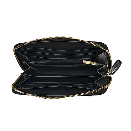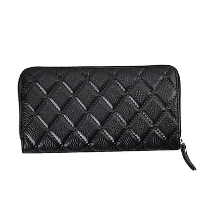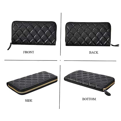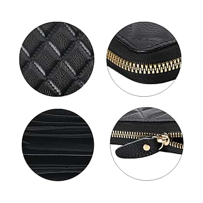 Genuine Leather Wallet with Embossed Rhombus Pattern & RFID Blocking - Black