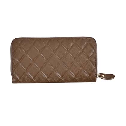 Genuine Leather Wallet with Embossed Rhombus Pattern - RFID Blocking - Brown