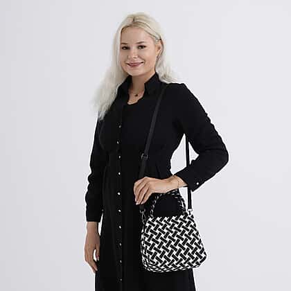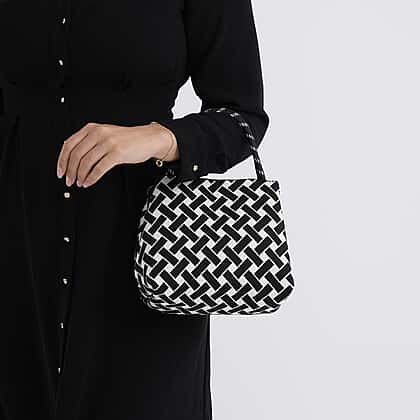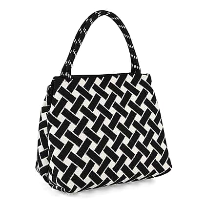 Geometric Woven Pattern Handbag with Shoulder Strap (130cm) - Black