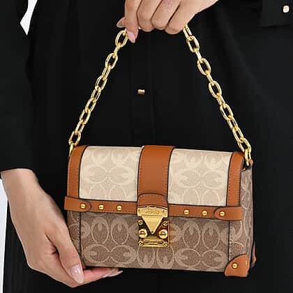 Guanchi Mini Trunk Crossbody Bag with Gold Chain Strap - Brown & Beige