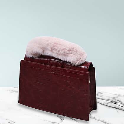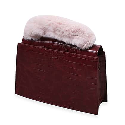 Inyati Olivia Croco Handbag with Removable Faux Fur Handle - Burgundy