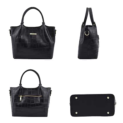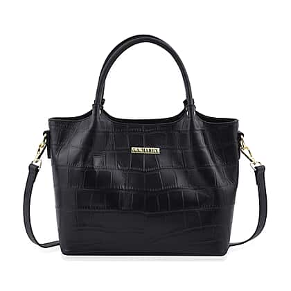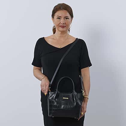 LA MAREY Genuine Leather Croc Embossed Convertible Bag with Detachable Strap - Black