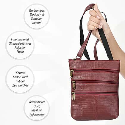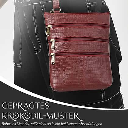 100% Genuine Leather Croco Embossed Crossbody Bag With Shoulder Strap - Burgundy