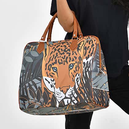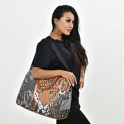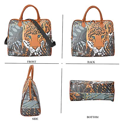 Tiger Head & Leaves Pattern Tote Bag with Handle Drop & Detachable Shoulder Strap - Brown