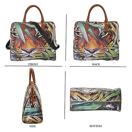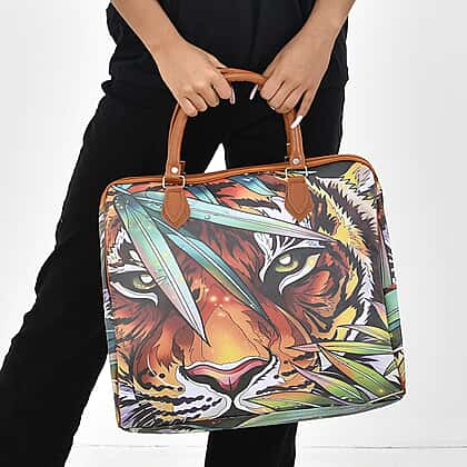 Tiger Head & Leaves Pattern Tote Bag with Handle Drop & Detachable Shoulder Strap - Brown