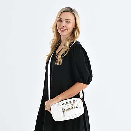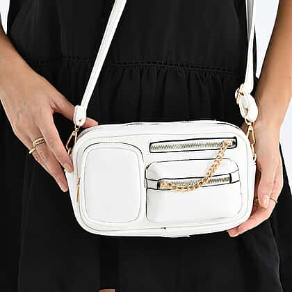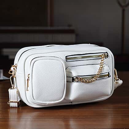 Multi-Pocket Crossbody Bag with Gold Chain Detail - White