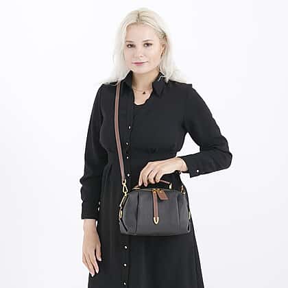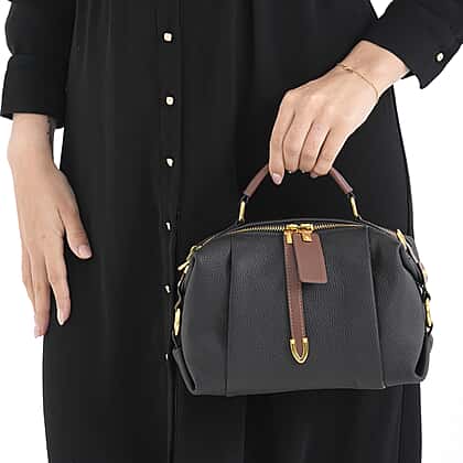 One Time Deal - Genuine Leather Crossbody Dual Section Fully Lined Bag With Adjustable Fabric Strap and Adjustable Leather Strap With Buckle - Black