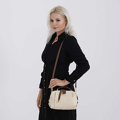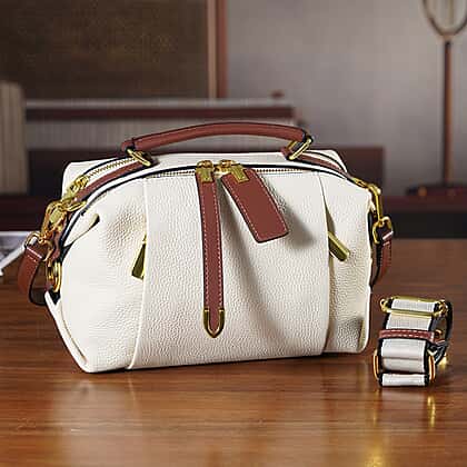 One Time Deal - Genuine Leather Crossbody Dual Section Fully Lined Bag With Adjustable Fabric Strap and Adjustable Leather Strap With Buckle - Ivory