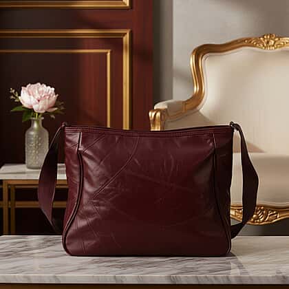 Patchwork Genuine Leather Crossbody Bag with Adjustable Shoulder Strap (125cm) - Burgundy