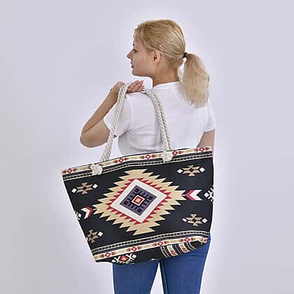 This versatile Polyester Tribal Tote Bag is designed for your daily needs. Its large size offers ample room for all your essentials, from cosmetics to a water bottle, sunglasses, and even a folding umbrella. The sturdy rope handles make it comfortable to carry, while the secure top zipper keeps everything safe. Inside, you’ll find a handy slip pocket for smaller items like your phone or keys. Whether heading to work, travelling, or just out for the day, this bag has you covered. Its easy-to-maintain fabric ensures it stays looking fresh, no matter the occasion.