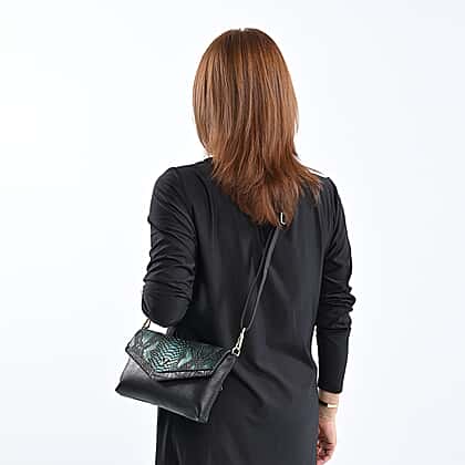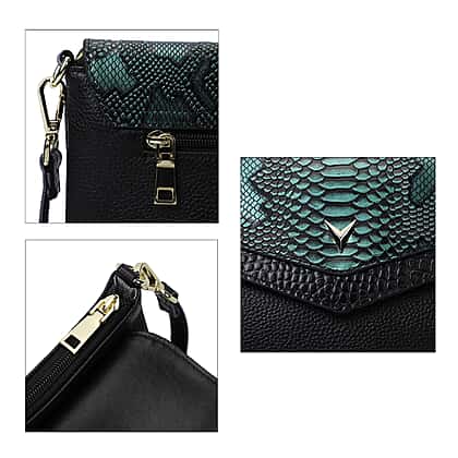 Hong Kong Closeout Deal - Genuine Leather Snake Print Crossbody Bag - Black and Green