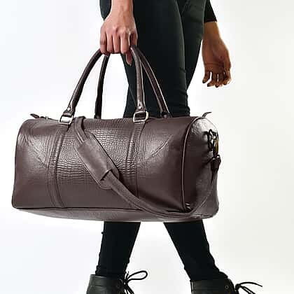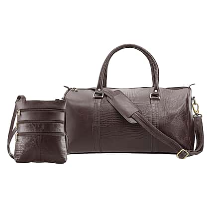 Set of 2 100% Leather Croco Embossed Luggage Duffle Bag with Crossbody Bag - Brown