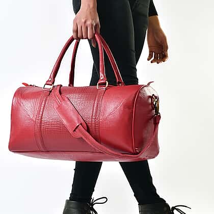 Set of 2 -100% Genuine Leather croco embossed luggage Duffle with croco embossed crossbody bag - Red