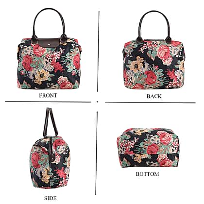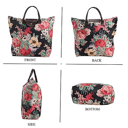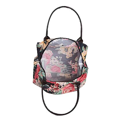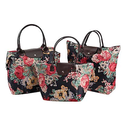 Set of 3 - Floral Pattern Tote Bag with Handle Drop - Black