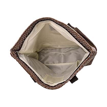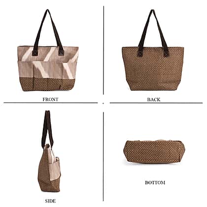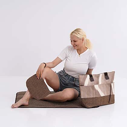Earthy, understated, and full of character, this woven geometric tote set blends function with modern design. The roomy khaki tote is crafted from durable polyester with two external pockets and a slip pocket inside to keep your belongings sorted. The small pouch secures your smaller bits, while the foldable picnic mat completes the trio beautifully. Its neutral tones and woven texture give it a naturally relaxed feel — perfect for countryside trips, commutes, or casual city days.