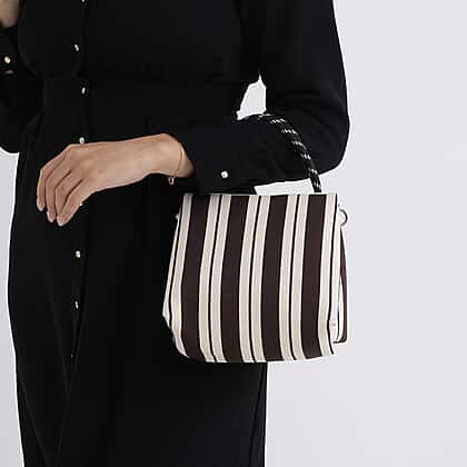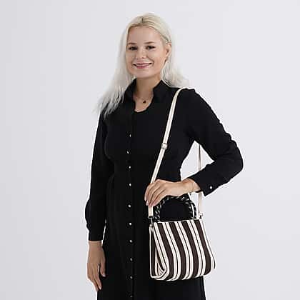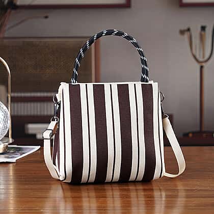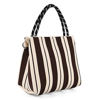 Striped Pattern Handbag with Shoulder Strap (130cm) - Coffee & White