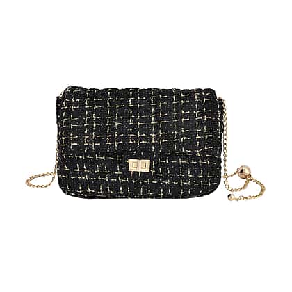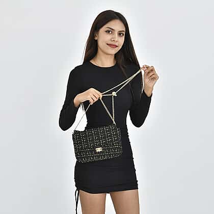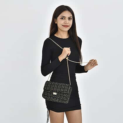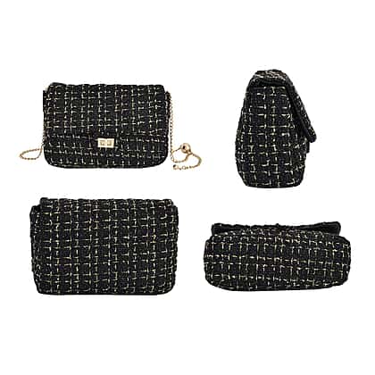 Designer Inspired Tweed Shoulder Bag with Adjustable Shoulder Metal Chain - Black