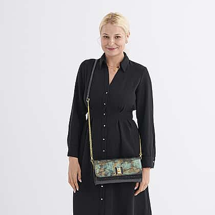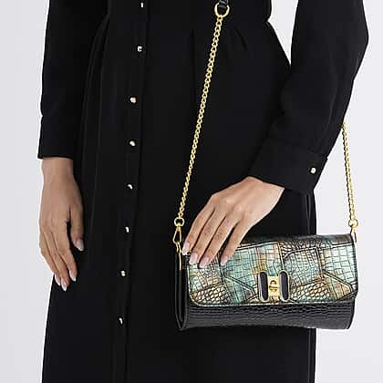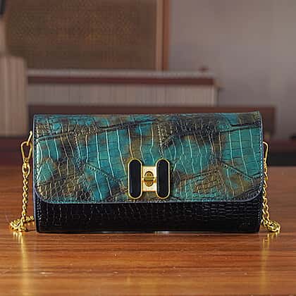 Two-Tone Embroidered Wallet Crossbody Bag with Chain Strap - Green, Black & Gold