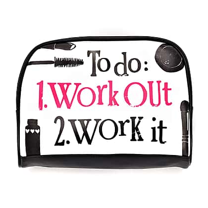 Stay stylish and keep your essentials organised with this white toiletry bag, suitable for everyday outings and holidays. This captivating and beautiful bag features a slogan, "work out and work it," making the bag more attractive. Expertly crafted with sturdy material, offering enough capacity and storage for toiletries. This lightweight and portable bag offers ease and is a must-have accessory for women who want to remain organised with style.