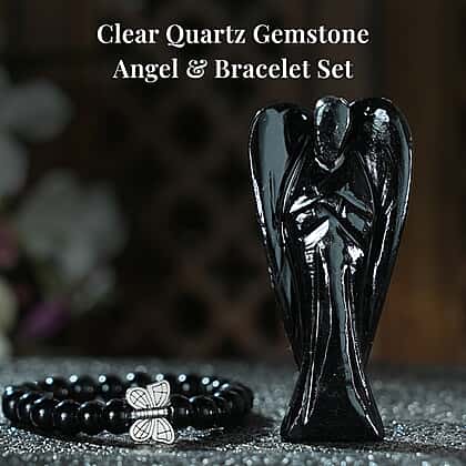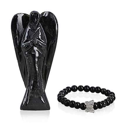 Handcarved Black Obsidian Guardian Angel Figurine Sculpture (Size 8 Cm) & Butterfly Stretchable Bracelet Presented in Velvet Pouch With Gift Card