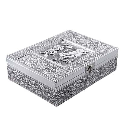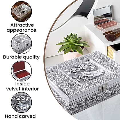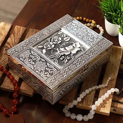 This Embossed Aluminium Storage Box is a must-have for anyone looking to store their cherished possessions. It's the perfect way to keep your trinkets safe and organised. The aluminium construction of the box ensures durability and protection for your belongings. The velvet-lined interior of the box keeps your items safe from scratches and damage. The 3D embossment of the flowers gives the box a unique designer look.