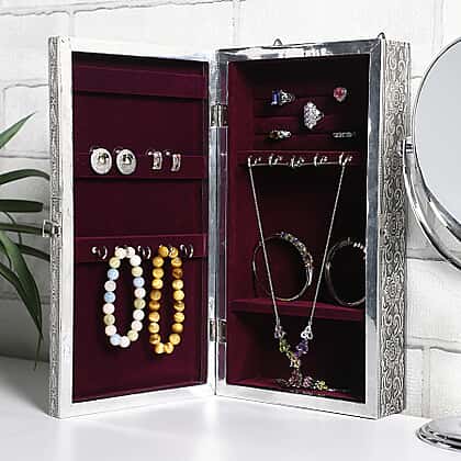 Embossed dream catcher motifs create a magnificent effect on the exterior with an oxidised finish. Indian artisans hand-crafted the sturdy frame of this Antique style oxidised jewellery armoire for enhanced durability Velvet lining helps your jewellery pieces from scratches and tarnishing. Metal hooks on two shelves on the left and one on the right allow easy storage and organisation for your accessories. This jewellery armoire measures 32x17x7 cm and comes with a metal clasp to enhance valuables' security.