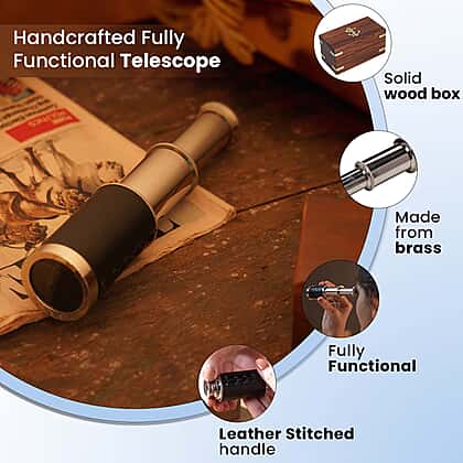 Handcrafted Fully Functional Telescope with Leather Stitched and Wooden Gift Box (Size 15x2 Cm) - Brown