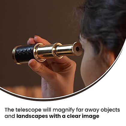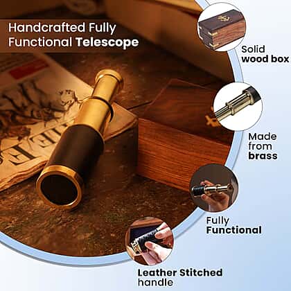 Get ready to go on your next adventure with this handcrafted telescope, and never leave a chance to witness the amazing things around you. This fully functional telescope has high-powered lenses, which give you a faraway sight. It has a beautiful leather stitched handle, elevating its style and the comfort of handling it. It is handcrafted by expert artisans with beautiful metalwork in brass and comes in a wooden gift box, making it an ideal choice for gifting to someone special.