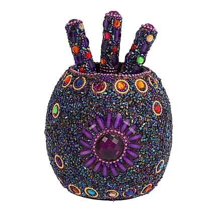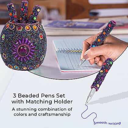 Handcrafted Set of 3 White Rhinestone Beaded Pens with Matching Holder Colour- Purple