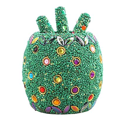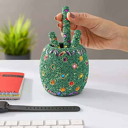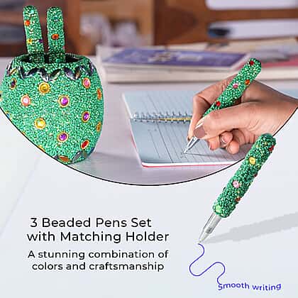 Handcrafted Set of 3 Green Rhinestone Beaded Pens with Matching Holder Colour - Green