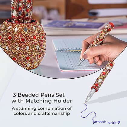 Handcrafted Set of 3 Red Rhinestone Beaded Pens with Matching Holder - Red