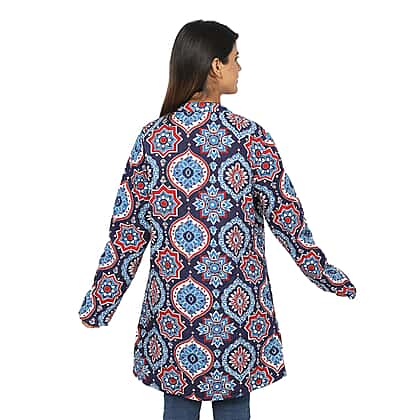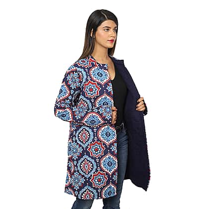 Handmade Printed Reversible Quilted Long Women's Jacket in Navy Blue and Multi Colour