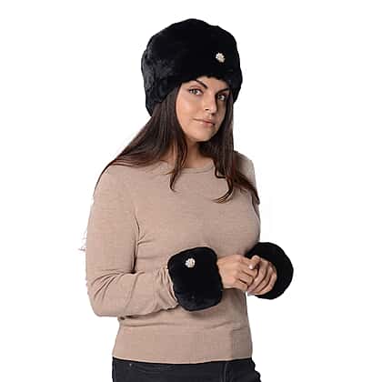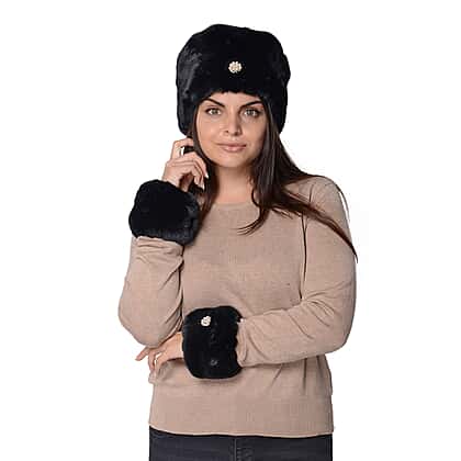 2 Piece Set Faux Fur Cossack Hat Size 15.2x58.4 Cm and Wrist Warmer Cuff Size 10.2x17.8 cm with Simulated Pearl Brooch in Black Colour