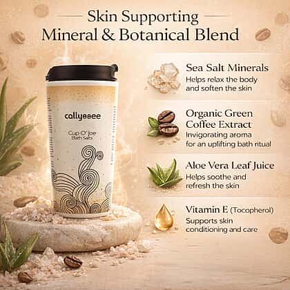 Indulge in a rejuvenating spa experience with Callyssee Cup O' Joe Bath Salts. Infused with the invigorating aroma of freshly brewed coffee, these bath salts awaken your senses and provide a luxurious self-care ritual. Packed with mineral-rich Dead Sea salt, they gently exfoliate and detoxify your skin, making it smooth and radiant. The energising coffee scent uplifts your mood, making every bath a revitalising escape. Treat yourself to the ultimate coffee-infused pampering with Callyssee Cup O' Joe Bath Salts.