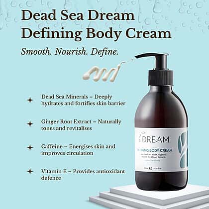 Indulge in the luxurious nourishment of Dead Sea Dream defining body cream, designed to leave your skin feeling smooth and rejuvenated. It is crafted with Dead Sea Minerals to moisturise and strengthen the skin barrier. The ginger root extract tones the skin while ingredients like caffeine and Vitamin E offers antioxidant protection. It is perfect for daily use, particularly for those with dry, sensitive skin, and those seeking anti-aging benefits. The creamy-textured formula seamlessly absorbs into the skin, providing effective protection against environmental pollution. A perfect choice for your skincare routine.
