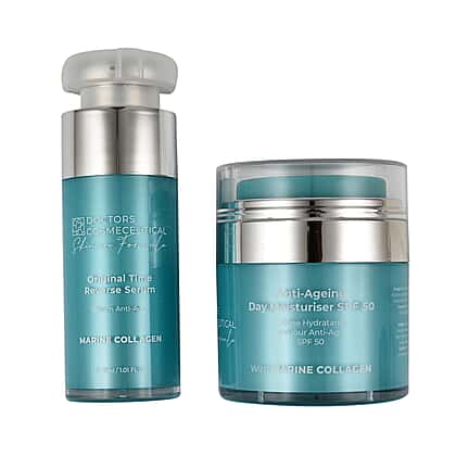 Experience the ultimate skincare duo from Doctors Formula - Marine Collagen Anti-Ageing Day Moisturizer SPF 50 and Time Reverse Serum. Indulge your skin with marine collagen's rejuvenating properties, reducing fine lines and wrinkles while providing broad-spectrum protection from harmful UV rays. Complement it with the Time Reverse Serum, promoting skin elasticity and radiance. Embrace a youthful glow that stands the test of time with Doctors Formula.